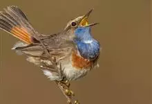 蓝点颏亦称“蓝喉歌鸲”,通称蓝靛颏儿。身体大小和麻雀相似,体长12-13厘米,体重17-18克。头部、上体主要为土褐色。眉纹白色。尾羽黑褐色,基部栗红色。颏部、喉部辉蓝色,下面有黑色横纹。下体白色。…全部>>