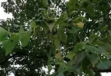乌桕 Small)大戟科乌桕属木本植物。树皮为暗灰色,有竖向的裂纹;枝条展开很广,有皮孔;叶片互生,形状为菱形、菱状卵形,也有菱状倒卵形;花为单性花,雌雄同株,花丝分离;子房卵球形,…全部>>
