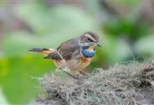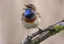 蓝点颏亦称“蓝喉歌鸲”,通称蓝靛颏儿。身体大小和麻雀相似,体长12-13厘米,体重17-18克。头部、上体主要为土褐色。眉纹白色。尾羽黑褐色,基部栗红色。颏部、喉部辉蓝色,下面有黑色横纹。下体白色。…全部>>