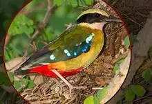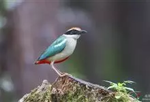 绿胸八色鸫:是雀形目八色鸫科的鸟类,共有12个亚种。体长为16-18厘米,体重65-69克。体型圆胖,尾短,腿长。头黑,上体绿色,两翼深色而具白色斑纹,头顶至后枕深褐,胸及腹部苹果绿,臀亮红。…全部>>