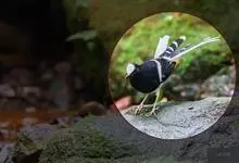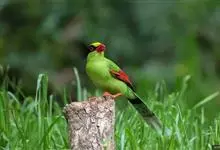 蓝绿鹊:中型鸟类,共有5个亚种。体长36-38厘米。尾长,嘴、脚红色。通体羽色主要为草绿色,宽阔的黑色贯眼纹向后延伸到后颈,在绿色的头侧极为醒目。两翅栗红色,内侧飞羽具黑色次端斑和白色尖端。尾绿色,…全部>>