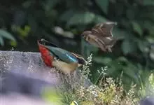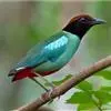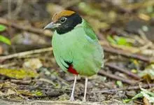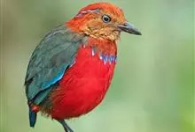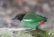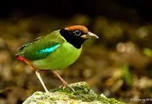 绿胸八色鸫:是雀形目八色鸫科的鸟类,共有12个亚种。体长为16-18厘米,体重65-69克。体型圆胖,尾短,腿长。头黑,上体绿色,两翼深色而具白色斑纹,头顶至后枕深褐,胸及腹部苹果绿,臀亮红。…全部>>