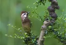 白颊噪鹛是雀形目噪鹛科噪鹛属鸟类,又称土画眉、小画眉、小噪鹃。成鸟额至头顶栗褐色,长眉纹、眼先和颊纹棕白色,眼后至耳羽深褐色,…全部>>
