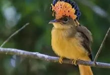 斑喉希鹛小型鸟类,体长14~17厘米。头具羽冠,前额和头顶羽冠金黄褐色,头侧灰黄色具黄色眼圈。上体灰橄榄绿色,外侧飞羽表面橘黄色、基部具黑色翼斑;内侧飞羽表面淡灰色具黑色亚端斑和白色端斑。尾羽黑色,…全部>>