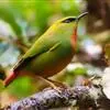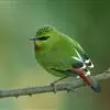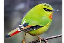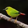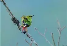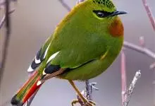 火尾绿鹛是莺科、绿鹛属小型鸟类,体长11-14厘米。上体绿色,头顶至枕具黑色鳞状斑,眼先和眼后黑色,眉纹黄绿色。两翅黑色具黄色和红色翅斑及白色端斑,极为醒目。中央一对尾羽绿色,外侧尾羽鲜红色。…全部>>