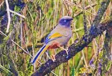 橙翅噪鹛:是噪鹛科、彩翼噪鹛属的中型鸟类,体长22-25厘米。头顶深葡萄灰色或沙褐色。上体灰橄榄褐色,外侧飞羽外翈蓝灰色、基部橙黄色,中央尾羽灰褐色,外侧尾羽外翈绿色而缘以橙黄色并具白色端斑。…全部>>