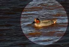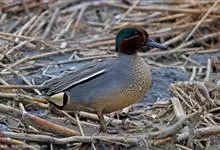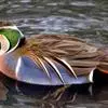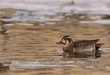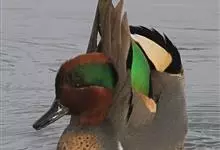 绿翅鸭是小型鸭类,体长37厘米,体重约0.5千克。嘴脚均为黑色。雄鸟头至颈部深栗色,头顶两侧从眼开始有一条宽阔的绿色带斑一直延伸至颈侧,尾下覆羽黑色,两侧各有一黄色三角形斑,在水中游泳时,极为醒目。…全部>>