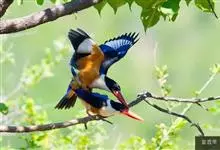 白领翡翠:有50个亚种。体长18厘米,体重35-40克。是一种蓝白色翡翠鸟。头顶、两翼、背及尾呈亮丽蓝绿色;过眼纹黑色;眼先黑色,眼眉白色或浅黄色,嘴上部具白点。以白色的颈环及下体为识别特征。…全部>>