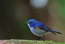 红胁蓝尾鸲俗名:蓝点冈子、蓝尾巴根子、蓝尾杰、蓝尾欧鸲。体型略小而喉白的鸲。特征为橘黄色两胁与白色腹部及臀成对比。雄鸟上体蓝色,眉纹白;亚成鸟及雌鸟褐色,尾蓝。…全部>>