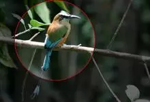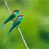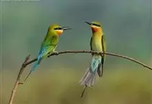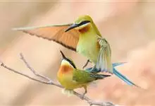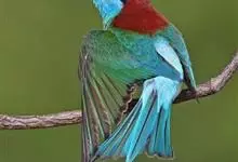 蓝喉蜂是蜂虎科蜂虎属鸟类。体长26-28厘米,嘴长而弯曲,有明显细长的中央尾羽。头部、颈部和背部为巧克力色,有黑色眼纹。喉部、腰部和尾羽为蓝色。腹部和两翼为绿色。幼鸟外观似成鸟,头部、颈部和背部为绿色,…全部>>