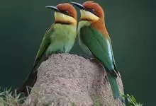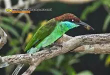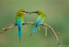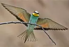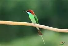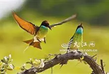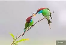 栗喉蜂虎是蜂虎科蜂虎属的鸟类。有热带鸟类羽毛艳丽的特征:喉部是栗红色的,黑色的过眼纹,翅膀和背部是绿色的,尾翼是蓝色的,飞行时翅膀下面的羽毛是橙黄色的,在阳光的照射下,它们全身闪烁着金属般的艳丽光泽,…全部>>