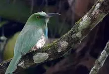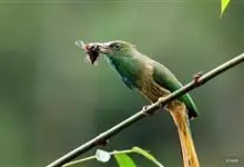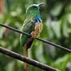 蓝须夜蜂虎是佛法僧目、蜂虎科的鸟类,体长约30厘米,是绿色林栖型蜂虎,蓝色的胸羽蓬松,嘴厚重而下弯。成鸟顶冠淡蓝,腹部棕黄带绿色纵纹。尾羽腹面黄褐。亚成鸟全身绿色。喉、胸部中央的羽甚长和亮色;该物种…全部>>