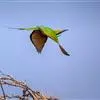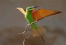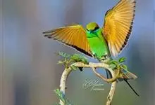 绿喉蜂虎是佛法僧目、蜂虎科的小型鸟类,共有9个亚种。身长22-25厘米,翼展29-30厘米,体重15-20克。喉绿色,额部、头顶至上背为锈红色,其余上体均为亮绿色。中央尾羽延长且端段狭细,…全部>>