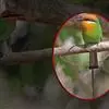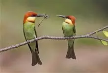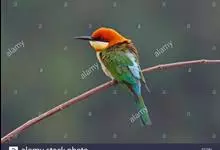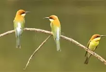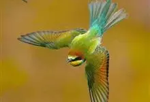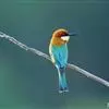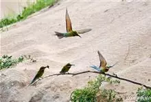 栗喉蜂虎是蜂虎科蜂虎属的鸟类。有热带鸟类羽毛艳丽的特征:喉部是栗红色的,黑色的过眼纹,翅膀和背部是绿色的,尾翼是蓝色的,飞行时翅膀下面的羽毛是橙黄色的,在阳光的照射下,它们全身闪烁着金属般的艳丽光泽,…全部>>