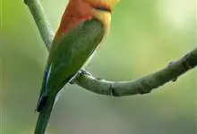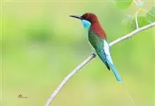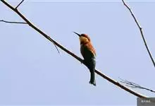 栗喉蜂虎是蜂虎科蜂虎属的鸟类。有热带鸟类羽毛艳丽的特征:喉部是栗红色的,黑色的过眼纹,翅膀和背部是绿色的,尾翼是蓝色的,飞行时翅膀下面的羽毛是橙黄色的,在阳光的照射下,它们全身闪烁着金属般的艳丽光泽,…全部>>