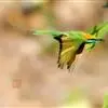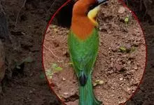 栗喉蜂虎是蜂虎科蜂虎属的鸟类。有热带鸟类羽毛艳丽的特征:喉部是栗红色的,黑色的过眼纹,翅膀和背部是绿色的,尾翼是蓝色的,飞行时翅膀下面的羽毛是橙黄色的,在阳光的照射下,它们全身闪烁着金属般的艳丽光泽,…全部>>