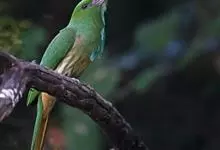 蓝须夜蜂虎是佛法僧目、蜂虎科的鸟类,体长约30厘米,是绿色林栖型蜂虎,蓝色的胸羽蓬松,嘴厚重而下弯。成鸟顶冠淡蓝,腹部棕黄带绿色纵纹。尾羽腹面黄褐。亚成鸟全身绿色。喉、胸部中央的羽甚长和亮色;该物种…全部>>