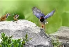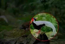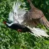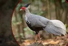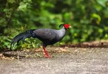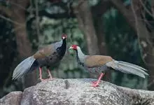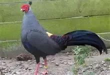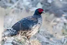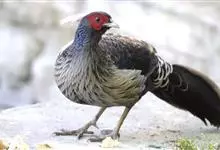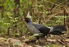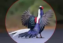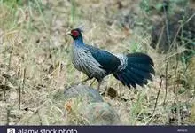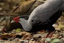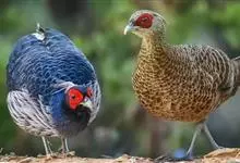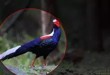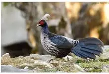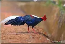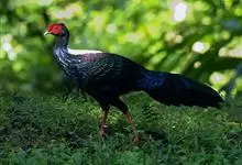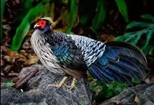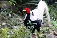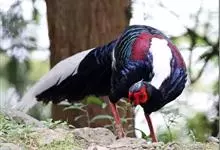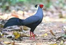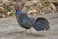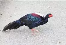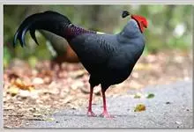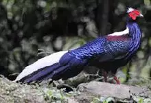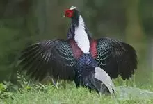 蓝鹇是雉科、鹇属一种大型雉类。体长50-80厘米。雄鸟头颈黑色,羽冠白色,有时杂以黑斑;脸红色,额部肉冠和脸部肉垂亦为红色;后颈和颈侧蓝黑色;肩赤红色;翅上覆羽及外侧次级飞羽黑色,…全部>>