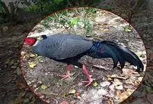 黑鹇是鸡形目雉科目鹇属鸟类,又称鸬雉、黑鸡。体型中等。雄鸟上体黑褐色,背羽具黑紫色金属光泽;头顶具黑羽冠;脸部裸皮呈红色,散生稀疏黑色纤羽;尾长而侧扁,中央两对尾羽红褐色,…全部>>