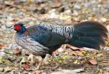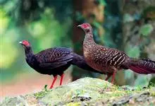 黑鹇是鸡形目雉科目鹇属鸟类,又称鸬雉、黑鸡。体型中等。雄鸟上体黑褐色,背羽具黑紫色金属光泽;头顶具黑羽冠;脸部裸皮呈红色,散生稀疏黑色纤羽;尾长而侧扁,中央两对尾羽红褐色,…全部>>