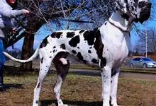 大丹犬原产于德国,历史上曾用做猎犬、护卫犬、斗犬、使役犬等,因其性格温顺、外貌优美,现今的发展方向主要是家庭用犬。该品种外貌高大、优美,体高与体长相当。公犬体高在76cm以上,母犬体高在71cm以上,…全部>>