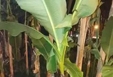 香蕉’),芭蕉科芭蕉属多年生草本植物,植株丛生,有匐匍茎;假茎浓绿有黑色斑点;叶片长圆形,上面为深绿色,无白粉,下面浅绿色;花朵为乳白色或淡紫色;果实呈弯曲的弓状,有棱,果皮为青绿色,…全部>>