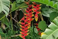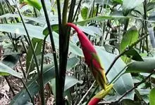 金嘴蝎尾蕉:芭蕉科,蝎尾蕉属多年生草本植物。株高可达6米。叶片长圆形,叶面绿色,叶背亮紫色;顶生花序,直立,薄被短柔毛;苞片绿色,开放时突露,花被片红色,顶端绿色,狭圆柱形,果三棱形,灰蓝色,有种子…全部>>