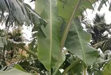 香蕉’),芭蕉科芭蕉属多年生草本植物,植株丛生,有匐匍茎;假茎浓绿有黑色斑点;叶片长圆形,上面为深绿色,无白粉,下面浅绿色;花朵为乳白色或淡紫色;果实呈弯曲的弓状,有棱,果皮为青绿色,…全部>>