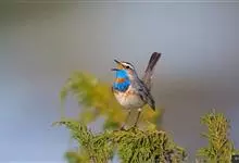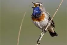 蓝点颏亦称“蓝喉歌鸲”,通称蓝靛颏儿。身体大小和麻雀相似,体长12-13厘米,体重17-18克。头部、上体主要为土褐色。眉纹白色。尾羽黑褐色,基部栗红色。颏部、喉部辉蓝色,下面有黑色横纹。下体白色。…全部>>