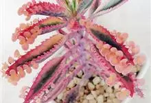 棒叶落地生根是景天科、落地生根属植物。茎直立、粉褐色。叶圆棒形,上表面有沟、粉色,有红褐斑。叶片交互对生,交叉排列成十字形。叶端锯齿上长有很小的幼株、落地后即可生根成活。原产非洲马达加斯加。…全部>>