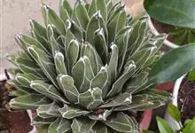皇后龙舌兰是天门冬科、龙舌兰属多年生草本多浆植物。无主茎,叶丛生,莲座状,株幅40厘米。叶较多,先端较细,三棱形,腹面扁平,背面圆形呈微龙骨凸起,长10-30厘米,宽2.5-7.5厘米,厚肉质硬,…全部>>