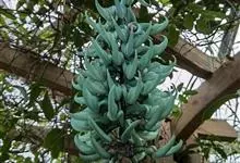 翡翠葛是豆科翡翠葛属植物,多年生常绿大型藤本,茎木质,直径可达30厘米,长可达21.3米。三出复叶,革质光亮,小叶长椭圆形,长7.6-12.7厘米,中间小叶最长。花两性,春季至初夏开花,蓝绿色,…全部>>