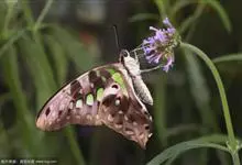 青带凤蝶Graphium sarpedon ,又名青凤蝶,是最普遍的中型凤蝶,飞行速度很快。青带凤蝶的翅膀中央有许多浅蓝色的斑点,很整齐地排列成一条直线。这些斑点由上而下逐渐变大,就像一条青色的带子。全部>>