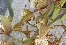 虎头兰是兰科兰属附生植物。假鳞茎窄椭圆形或窄卵形;叶呈带形;花葶长45-60厘米,苞片卵状三角形,花有香气,萼片与花瓣绿或黄绿色,基部疏生深红色斑点或偶有淡红褐色晕,唇瓣白色或奶油黄色,…全部>>