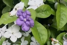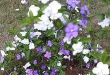 鸳鸯茉莉,茄科鸳鸯茉莉属常绿灌木植物,高1米。茎皮深褐色;分枝力强;单叶互生纸质;花簇生,聚伞花序,花冠五裂花瓣锯齿,含苞时蘑菇状深紫色,花香浓郁;花期4-10月。鸳鸯茉莉花朵芳香,…全部>>