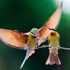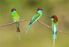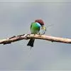 栗喉蜂虎是蜂虎科蜂虎属的鸟类。有热带鸟类羽毛艳丽的特征:喉部是栗红色的,黑色的过眼纹,翅膀和背部是绿色的,尾翼是蓝色的,飞行时翅膀下面的羽毛是橙黄色的,在阳光的照射下,它们全身闪烁着金属般的艳丽光泽,…全部>>