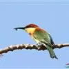 栗喉蜂虎是蜂虎科蜂虎属的鸟类。有热带鸟类羽毛艳丽的特征:喉部是栗红色的,黑色的过眼纹,翅膀和背部是绿色的,尾翼是蓝色的,飞行时翅膀下面的羽毛是橙黄色的,在阳光的照射下,它们全身闪烁着金属般的艳丽光泽,…全部>>