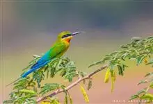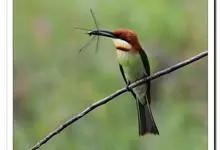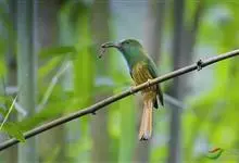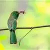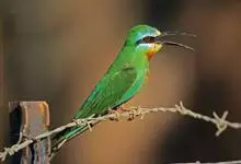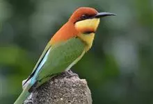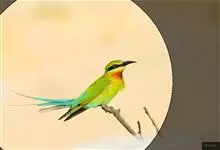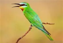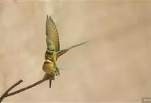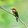 栗喉蜂虎是蜂虎科蜂虎属的鸟类。有热带鸟类羽毛艳丽的特征:喉部是栗红色的,黑色的过眼纹,翅膀和背部是绿色的,尾翼是蓝色的,飞行时翅膀下面的羽毛是橙黄色的,在阳光的照射下,它们全身闪烁着金属般的艳丽光泽,…全部>>