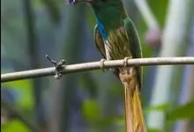 蓝须夜蜂虎是佛法僧目、蜂虎科的鸟类,体长约30厘米,是绿色林栖型蜂虎,蓝色的胸羽蓬松,嘴厚重而下弯。成鸟顶冠淡蓝,腹部棕黄带绿色纵纹。尾羽腹面黄褐。亚成鸟全身绿色。喉、胸部中央的羽甚长和亮色;该物种…全部>>