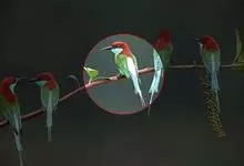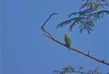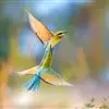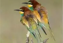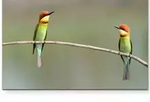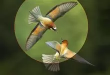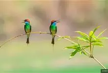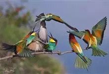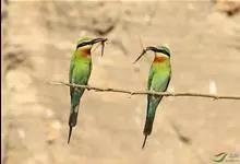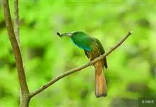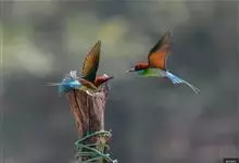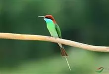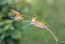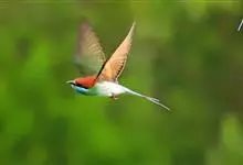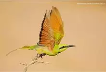 栗喉蜂虎是蜂虎科蜂虎属的鸟类。有热带鸟类羽毛艳丽的特征:喉部是栗红色的,黑色的过眼纹,翅膀和背部是绿色的,尾翼是蓝色的,飞行时翅膀下面的羽毛是橙黄色的,在阳光的照射下,它们全身闪烁着金属般的艳丽光泽,…全部>>