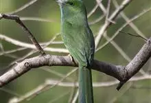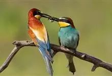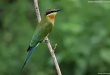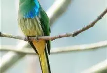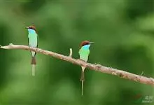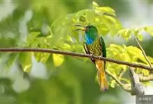 蓝喉蜂是蜂虎科蜂虎属鸟类。体长26-28厘米,嘴长而弯曲,有明显细长的中央尾羽。头部、颈部和背部为巧克力色,有黑色眼纹。喉部、腰部和尾羽为蓝色。腹部和两翼为绿色。幼鸟外观似成鸟,头部、颈部和背部为绿色,…全部>>