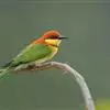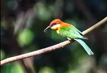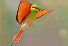 绿喉蜂虎是佛法僧目、蜂虎科的小型鸟类,共有9个亚种。身长22-25厘米,翼展29-30厘米,体重15-20克。喉绿色,额部、头顶至上背为锈红色,其余上体均为亮绿色。中央尾羽延长且端段狭细,…全部>>