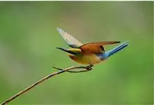 栗喉蜂虎是蜂虎科蜂虎属的鸟类。有热带鸟类羽毛艳丽的特征:喉部是栗红色的,黑色的过眼纹,翅膀和背部是绿色的,尾翼是蓝色的,飞行时翅膀下面的羽毛是橙黄色的,在阳光的照射下,它们全身闪烁着金属般的艳丽光泽,…全部>>
