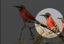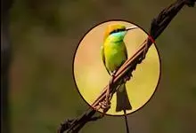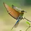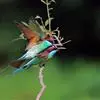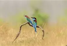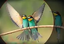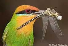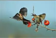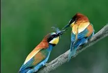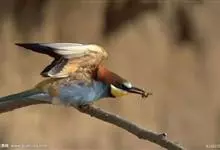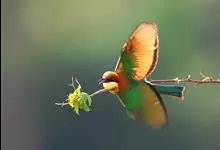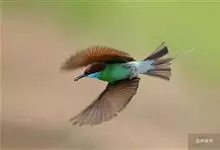 栗喉蜂虎是蜂虎科蜂虎属的鸟类。有热带鸟类羽毛艳丽的特征:喉部是栗红色的,黑色的过眼纹,翅膀和背部是绿色的,尾翼是蓝色的,飞行时翅膀下面的羽毛是橙黄色的,在阳光的照射下,它们全身闪烁着金属般的艳丽光泽,…全部>>
