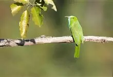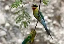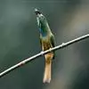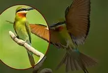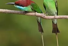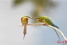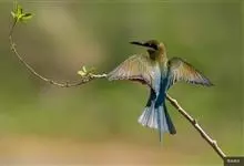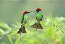 蓝喉蜂是蜂虎科蜂虎属鸟类。体长26-28厘米,嘴长而弯曲,有明显细长的中央尾羽。头部、颈部和背部为巧克力色,有黑色眼纹。喉部、腰部和尾羽为蓝色。腹部和两翼为绿色。幼鸟外观似成鸟,头部、颈部和背部为绿色,…全部>>