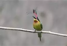蓝颊蜂虎:是蜂虎科、蜂虎属的鸟类,共有2个亚种。体长27-33厘米,翼展46-49厘米,体重38-50克。嘴形细长而下弯,先端尖,…全部>>