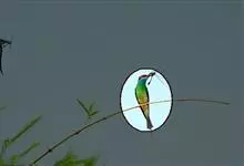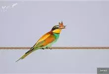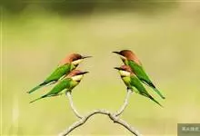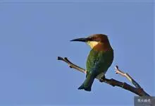 栗喉蜂虎是蜂虎科蜂虎属的鸟类。有热带鸟类羽毛艳丽的特征:喉部是栗红色的,黑色的过眼纹,翅膀和背部是绿色的,尾翼是蓝色的,飞行时翅膀下面的羽毛是橙黄色的,在阳光的照射下,它们全身闪烁着金属般的艳丽光泽,…全部>>