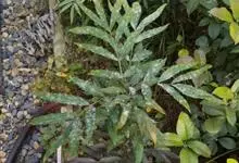 十大功劳 Fedde),小檗科十大功劳属常绿灌木植物。叶子较大且较多,呈椭圆形,绿色,表面光滑无毛,叶柄较长;花朵较小,呈多边形,黄色,花瓣对称分布,表面有绒毛;果实呈圆形,褐色,…全部>>