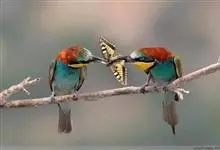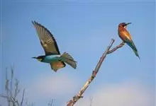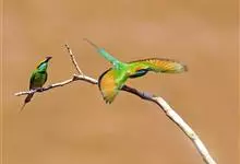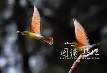 栗喉蜂虎是蜂虎科蜂虎属的鸟类。有热带鸟类羽毛艳丽的特征:喉部是栗红色的,黑色的过眼纹,翅膀和背部是绿色的,尾翼是蓝色的,飞行时翅膀下面的羽毛是橙黄色的,在阳光的照射下,它们全身闪烁着金属般的艳丽光泽,…全部>>
