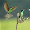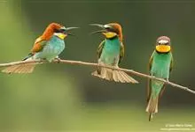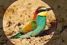 栗喉蜂虎是蜂虎科蜂虎属的鸟类。有热带鸟类羽毛艳丽的特征:喉部是栗红色的,黑色的过眼纹,翅膀和背部是绿色的,尾翼是蓝色的,飞行时翅膀下面的羽毛是橙黄色的,在阳光的照射下,它们全身闪烁着金属般的艳丽光泽,…全部>>